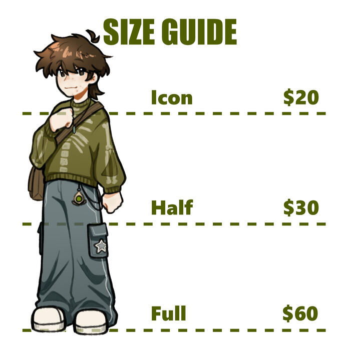 Icon--------$20usd--------Half Bod--------$30usd--------Full Bod--------$60usd--------